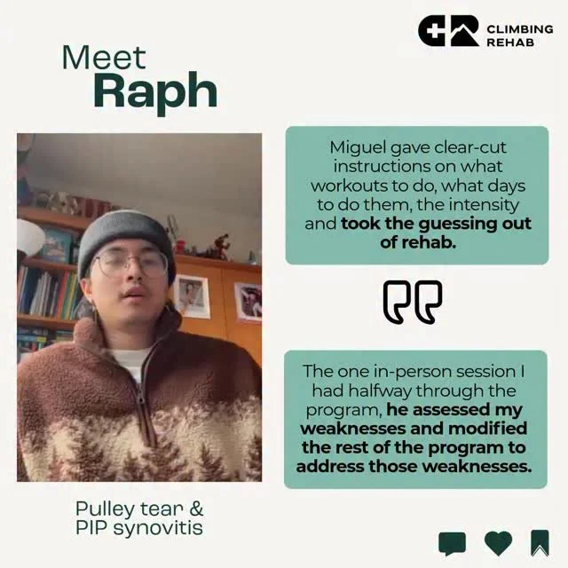 Dr. Miguel Zevallos is a Physical Therapist who helps climbers struggling with injuries go back to sending their hardest without pain. He quickly learned that rehab and climbing performance should not be separated into different stages, but instead combined in order to achieve the best results. Now he is committed to stop the unnecessary time off of the wall and make climbing specific rehab more accessible to the general public.